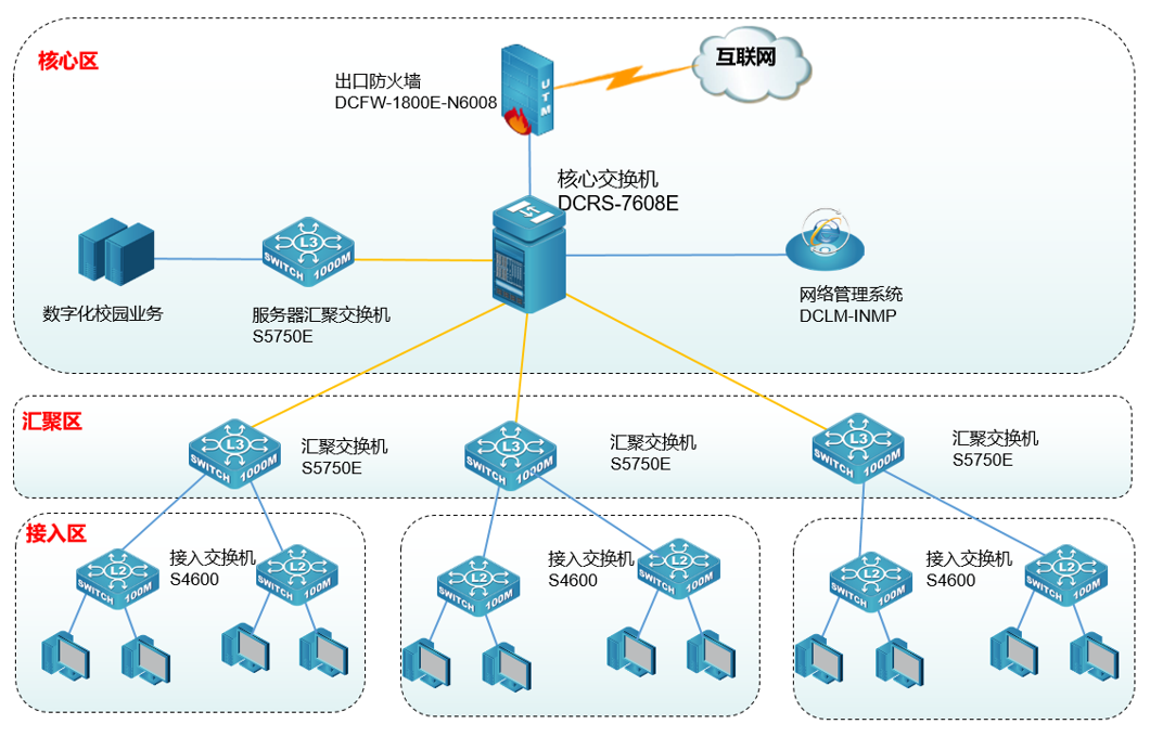 学校此次网络建设整体采用万兆主干,千兆到桌面,满足未来学校到带宽的需求,核心交换机采用DCRS-7608E,汇聚交换机采用支持三层路由和万兆上行交换机S5750E系列,接入采用千兆网管交换机S4600系列,支持双链路冗余备份,具备先进的绿色环保技术,为用户给予高性能、易管理、低成本的千兆到桌面的解决方案。网络核心区保证可靠、高效的数据交换,同时核心作为三层网关启用路由协议,主要负责区域内高速接入。此次选择DCRS-7608E万兆核心路由交换机作为全网的核心交换机,DCRS-7600E系列交换机拥有着先进的万兆以太网支持,最高可给予Tbps级的交换容量和Mbps级的包转发能力。在保持线速转发性能的基础上,支持各种高密度接口板,满足核心层设备高密度、高吞吐量的要求,可以简化网络结构、降低网络建设成本。另外DCRS-7608E还支持VSF虚拟化技术,未来可以顺利获得VSF技术可以实现跨设备的链路聚合,在简化网络配置的同时,提高了网络连接的带宽和可靠性,保证了网络的稳定运行,实现业务快速部署,构建业务定义网络。网络汇聚区采用S5750E万兆路由交换机,实现万兆主干,满足学校内网高速转发的需要。接入层分区具有高密度的接入能力,采用S4600系列具备千兆光口上联,给予主机和终端的接入,该层支持基于端口的访问控制,满足安全的接入。出口采用下一代防火墙DCFW-1800E-N6008,给予精细化应用管控,全面威胁检测与防护,强大的网络适应性,为用户给予业界领先的安全防护,保证网络和用户的安全。最后,为了有效的对网络进行统一的全方位实时监控、故障报警、紧急问题处理,还部署DCLM综合网管平台,顺利获得集中、直观、易于使用的用户管理界面显著地降低网络运营成本,并且给予清晰的网络管理和控制平台,实现安全实施和防御的网络实时监控,网络自动化和调度范围内的配置,快速、高效的故障排除。