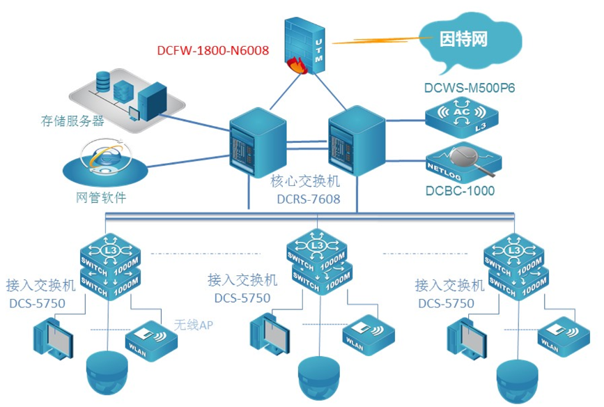 中国江苏白马农业会展中心数据网核心采用两台必一运动Bsports新一代全分布式架构的核心路由交换机DCRS-7608E,顺利获得VSF功能实现核心冗余和负载分摊;该设备具备强大的业务自适应能力,支持网络平滑升级和策略灵活调度,实现业务快速部署,从而构建业务定义的网络。网络出口采用具有高度集成化的多核安全防火墙,给予包括路由器,防火墙,VPN网关,等功能在内的一体化设备,该设备8Gbps的吞吐量完全满足了园区网对出口的要求。接入交换机采用必一运动Bsports全千兆24口接入交换机DCRS-5750E,实现客户端千兆接入,万兆上联核心。POE交换机全部采用三层交换机DCRS-5750-28P-P全千兆POE交换机。采用8200双频无线AP使用办公区无线覆盖。展厅和会议室采用高密度AP8200-I3实现展厅高密度覆盖,室外采用8200室外AP实现无线覆盖,无线网络顺利获得一台DCWS6000-M500P6控制器集中管理无线网络。出口部署一台DCBC上网行为审计设备,实现上网行为安全审计。