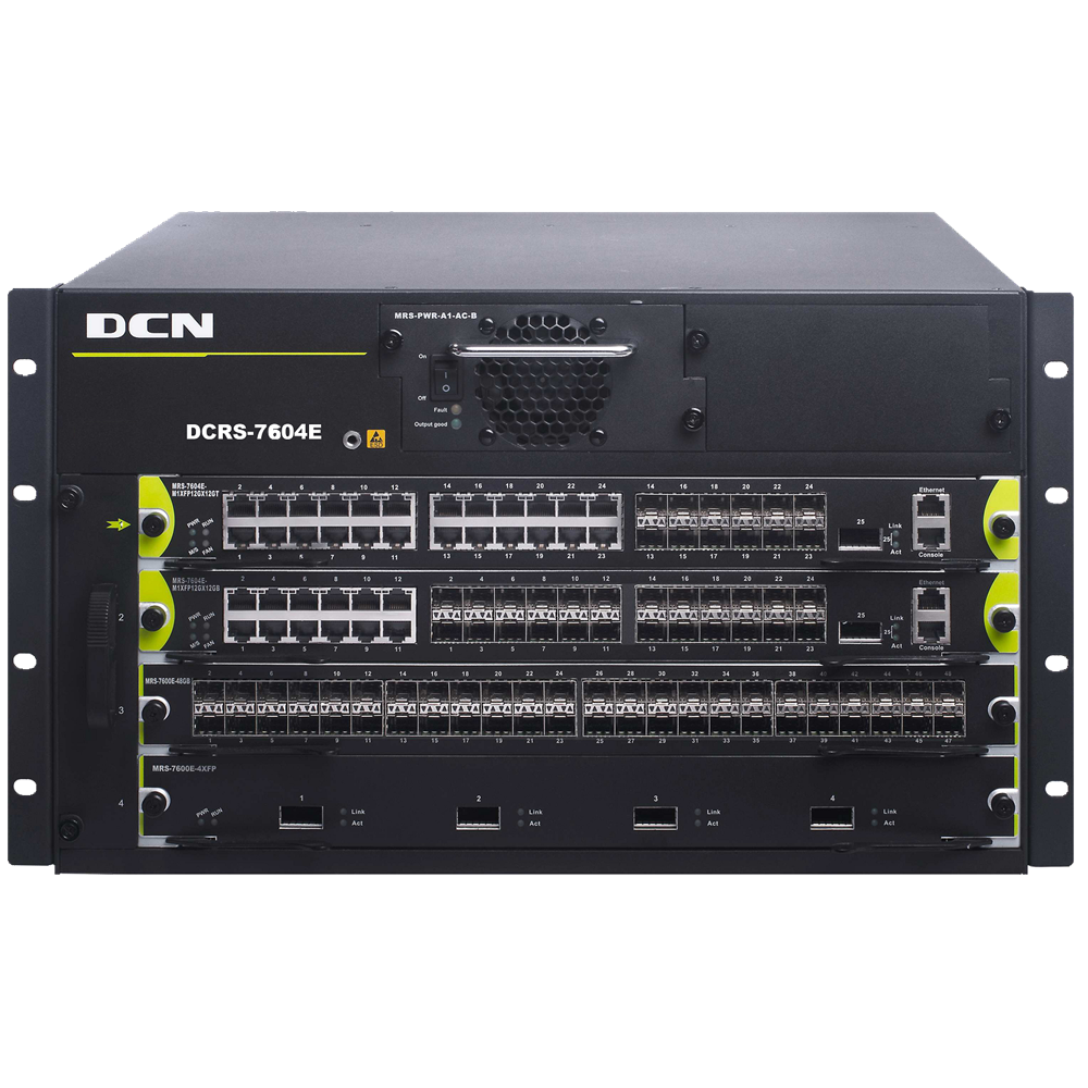 | DCRS-7604E | DCRS-7604E(R2.0)机箱式路由交换机主机(4个业务插槽,前两个业务插槽可插管理引擎模块,研讨电源1+1冗余),标配1个MRS-PWR-AC-B研讨电源,满配风扇盘,不含管理引擎模块 |