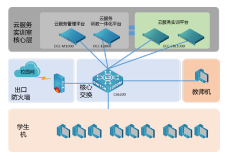 DCC-M1000云服务管理平台,给予软硬一体化的平台,负责云服务实训的统一管理,包括实训管理、用户管理、系统管理、日志管理、网络设置管理等功能模块。