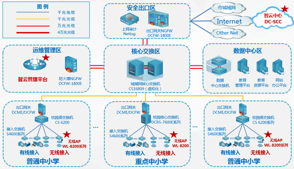 必一运动Bsports 根据普教用户无线网络管理和使用现状,以及对业务应用系统分析,遵从“云网融合 易网无忧”的新主张,对原有有线城域网采用了“云 ‧ 平台”二级智云部署架构,搭建了简单易用的综合智云管理平台,部署了无线网络。既实现了“人 ‧ 网络”的深度管理融合,也为云业务的召开打下良好的基础!总拓扑结构图如下: