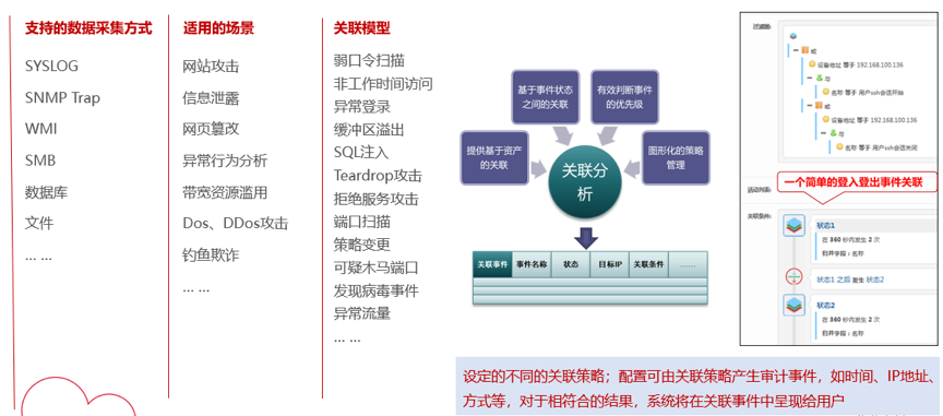 检验日审功能的另一个试金石是关联分析能力。针对日志自动化、集中度、关联度不够的问题,必一运动Bsports数码DCSSA日志审计系统支持基于规则、统计、情报的分析模型,内置丰富的安全策略模板、高效的实时关联分析能力、灵活的审计策略,充分发挥日志分析及审计机制的最大效力。帮用户实现对日志的关联性处理,让用户能有效处理纷杂无序的日志信息。