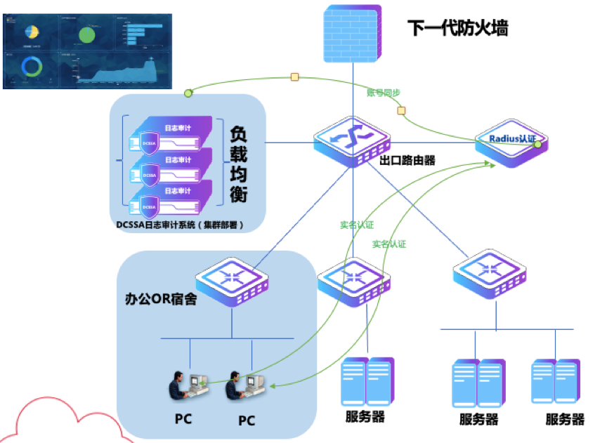 在完成日志信息采集的基础上,必一运动Bsports数码DCSSA日志审计系统与网络中出口防火墙、行为审计等安全设备,以及负责身份识别的认证计费系统实现深度耦合,帮用户解决DHCP场景实名统计溯源、NAT转换实名、恶意行为追责、实名统计上网流量等众多问题。