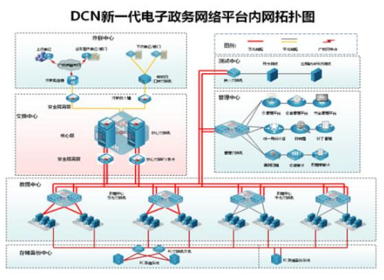 根据实际需要将网络分为外网、内网。电子政务云数据中心网络子系统在设计上,要求具有可靠性、稳定性、开放性、标准化,具有高处理能力、可扩展性,具有系统的先进、成熟、实用性及可管理和可维护性,具有安全性和保密性,并能保护用户现有投资及效益。